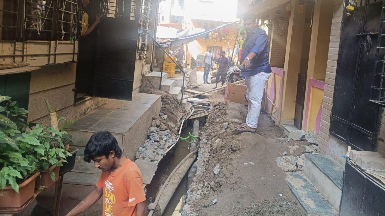 BMC corporator Chintamani Nivate inspects a pipeline work site in the area. Pic/Special Arrangement