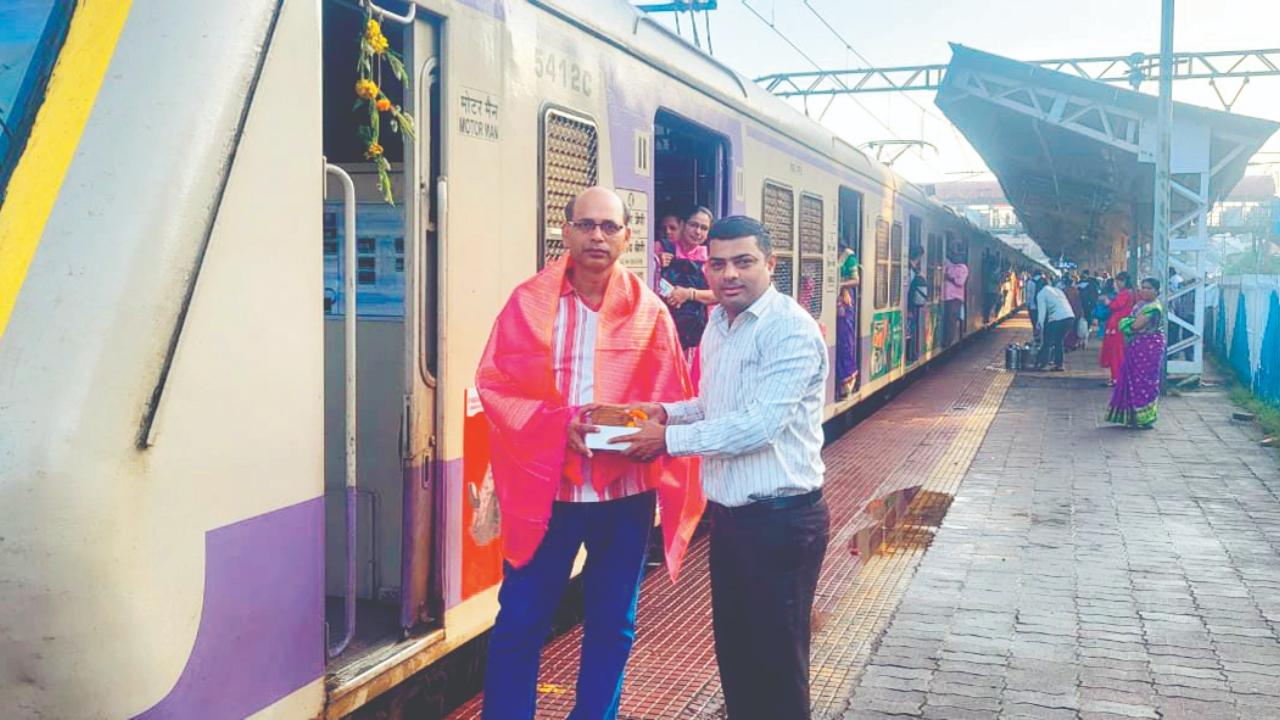 Ganesh Kadam, a social worker and daily commuter on the 7.28 am Kasara-CSMT fast local, took the lead in felicitating the motorman. As this correspondent took photos, Kadam approached the motorman’s cabin, requested him to step out, and honoured him with a coconut, shawl, and flowers.