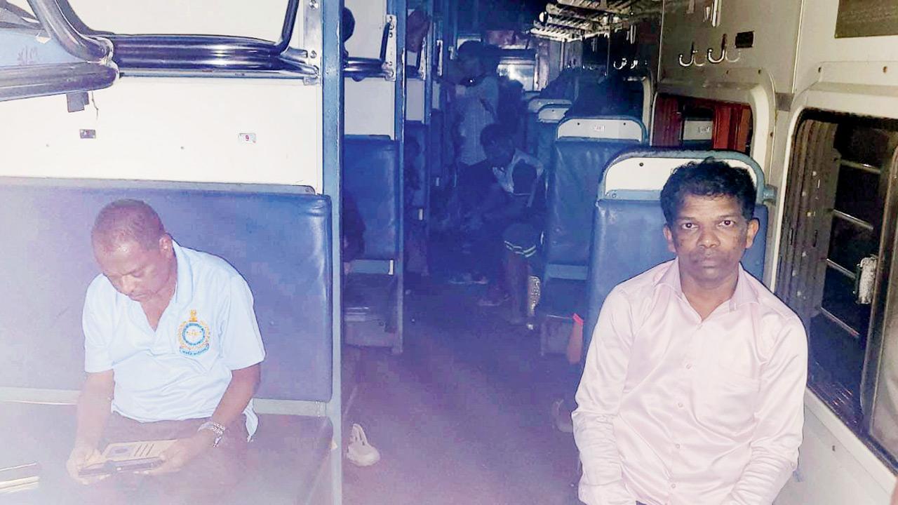 Passengers on the Diva-Sawantwadi Express sit in darkness after the railway authorities switch off lights and fans on Monday night. Pics/Shrikant Khuperkar