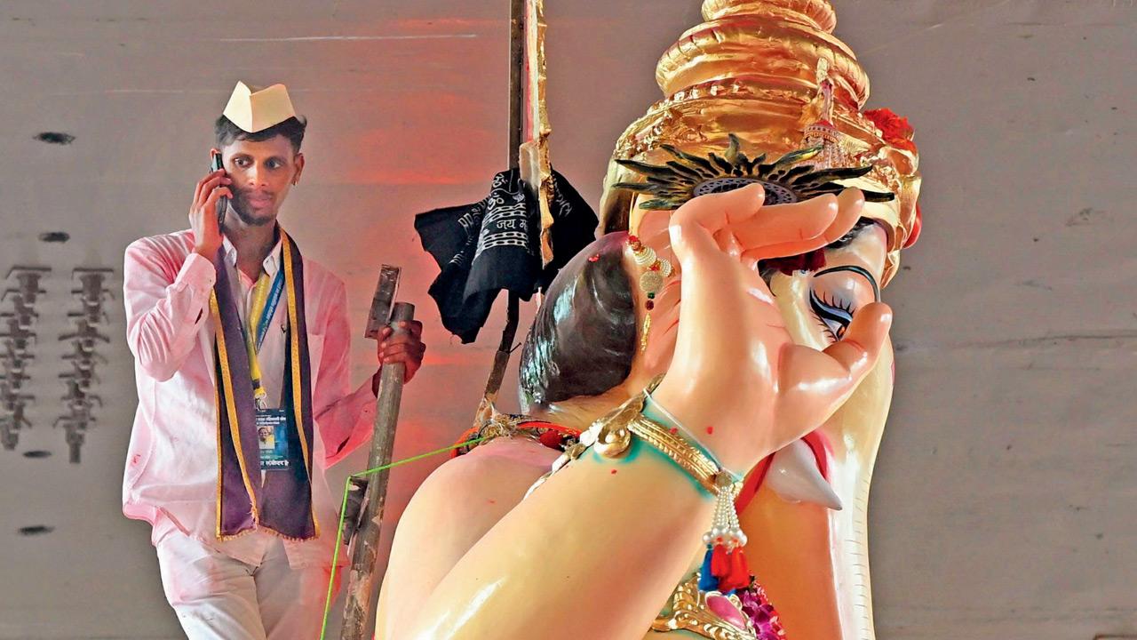 Despite the deafening din along the visarjan route, a mandal member accompanying a Ganesha idol under the Lalbaug bridge, seems to be busy on a call. PIC/SAYYED SAMEER ABEDI