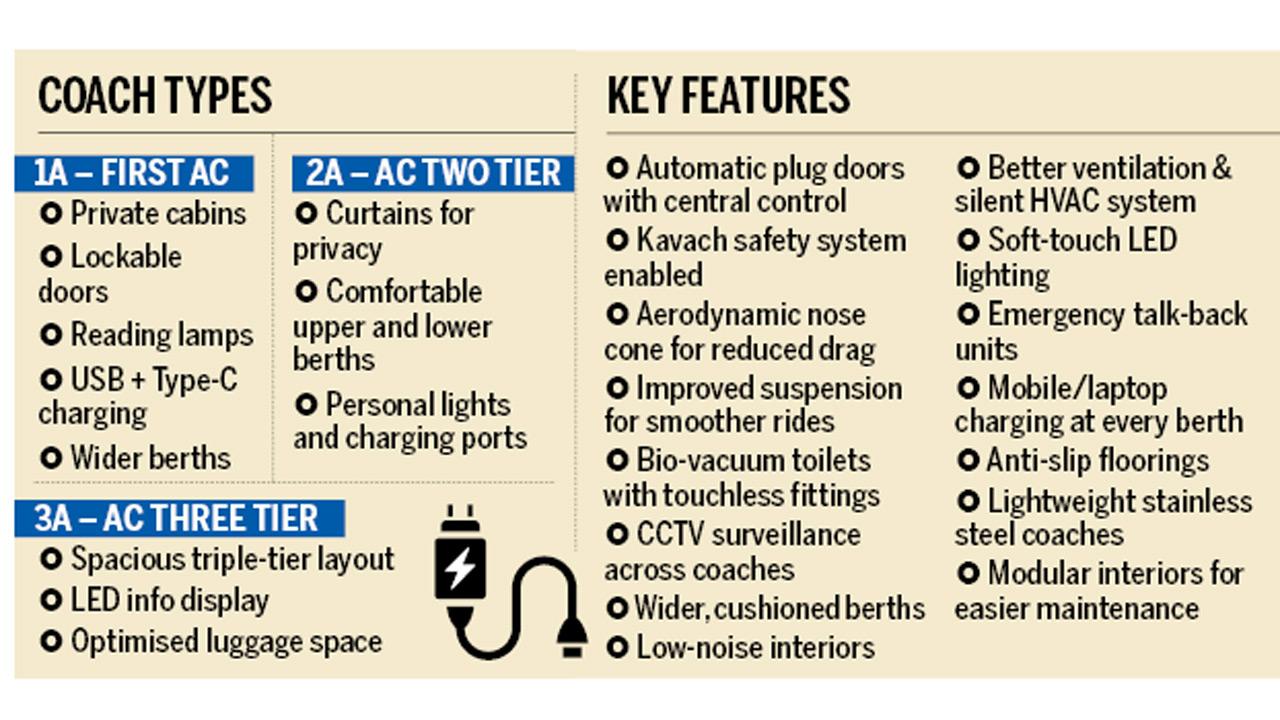This second rake, manufactured by BEML with technology from Integral Coach Factory, Chennai, is a key step towards the full launch of these long-distance sleeper trains. Improvements have been made to this rake by taking feedback based on the first rake. There have been upgrades to the toilets and berths, plus a few alterations, such as repositioning of some holding arms and fixtures. This 16-coach train includes 11 AC-3 tier coaches, 4 AC-2 tier coaches, and 1 First AC coach, all equipped with advanced features such as separate charging ports for Type A and C devices, a foldable snack table, an integrated lighting system, and a laptop charging setup.