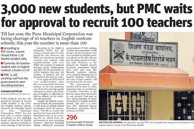 On Friday, mid-day had reported that while the English medium schools are getting good response, with another 3000 students admitted in PMC schools, it is struggling to maintain the quality of education as the shortage of teachers has increased from 40 to 100 (3,000 new students, but PMC waits for approval to recruit 100 teachers).