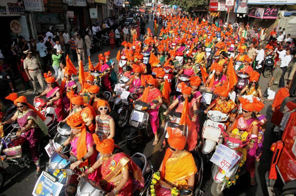 A group of Marathi women, dressed in traditional attires, with placards displaying a message to save girl child, as they walk on streets during 'Shobha Yatra', to celebrate the Maharashtrian new year 'Gudi Padwa', in Thane.