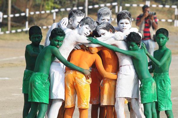 Indian school students painted in the colours of the national flag perform a dance during Republic Day celebrations in Secunderabad, the twin city of Hyderabad, on January 26, 2014