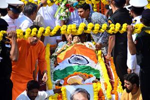In pic: The body of former Chief Minister of Goa and former defence minister, Manohar Parrikar is seen covered with India's national flag during his funeral in Panaji.