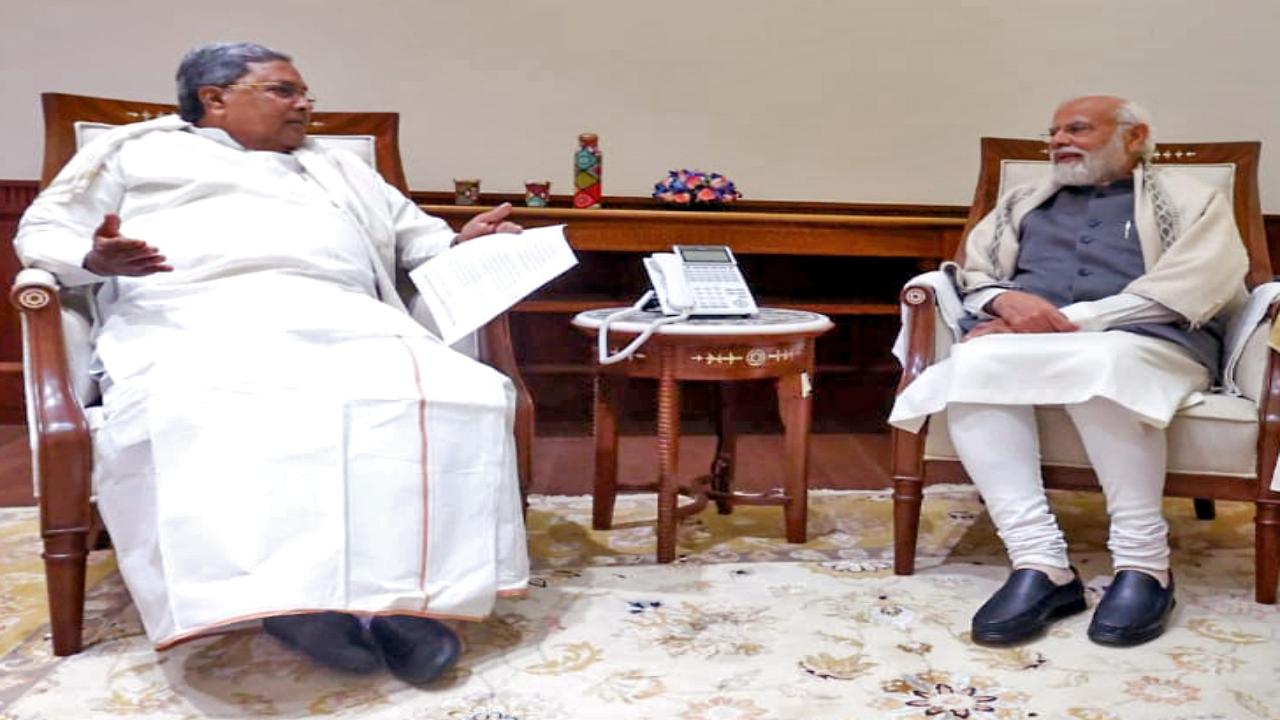 Karnataka Chief Minister Siddaramaiah on Tuesday met Prime Minister Narendra Modi in New Delhi and requested early release of a drought relief. Pic/PTI