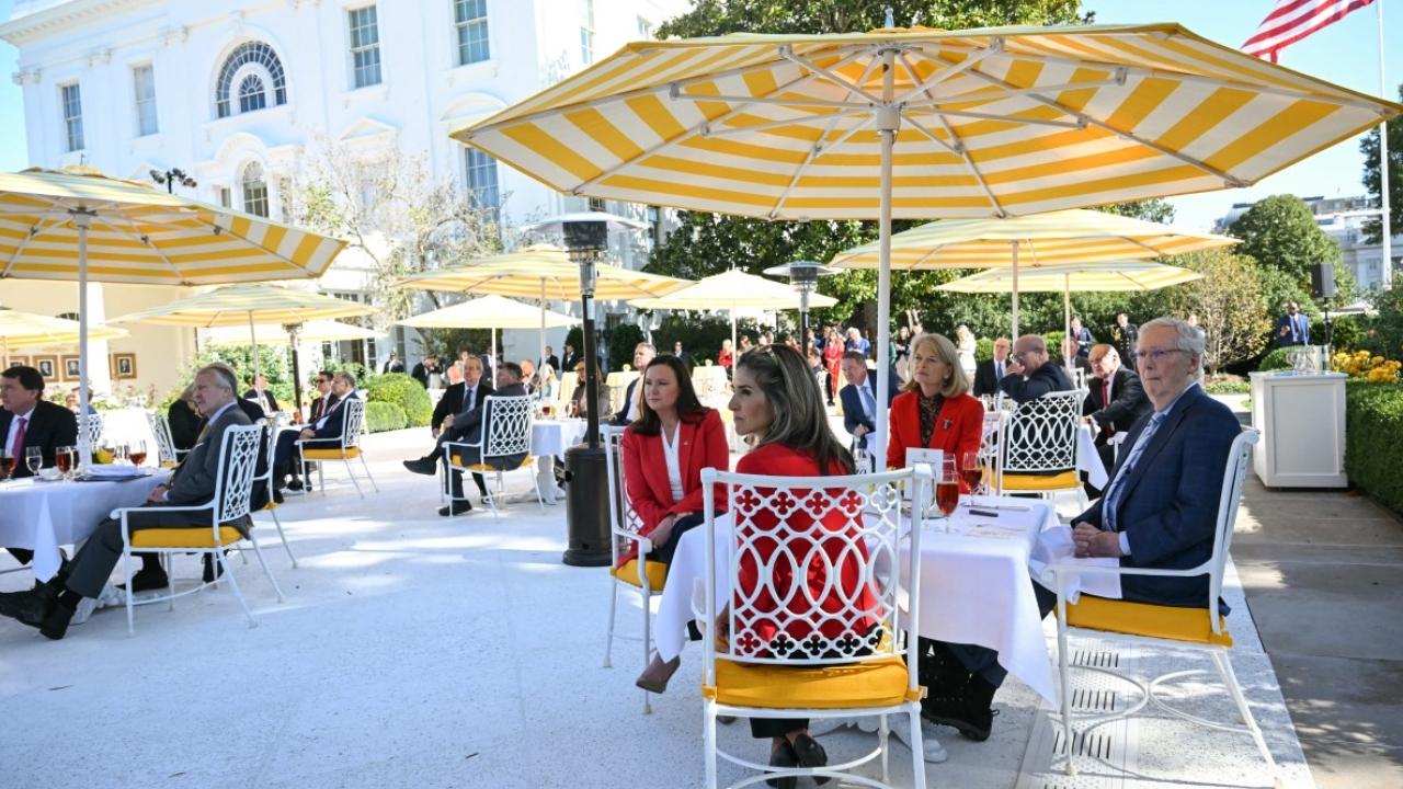 But as US President Donald Trump welcomed Republican senators for lunch in the newly renovated Rose Garden Club -- with the boom-boom of construction underway on the new White House ballroom -- he portrayed a different vision of America as a unified GOP refuses to yield to Democratic demands for health care funds, and the government shutdown drags on