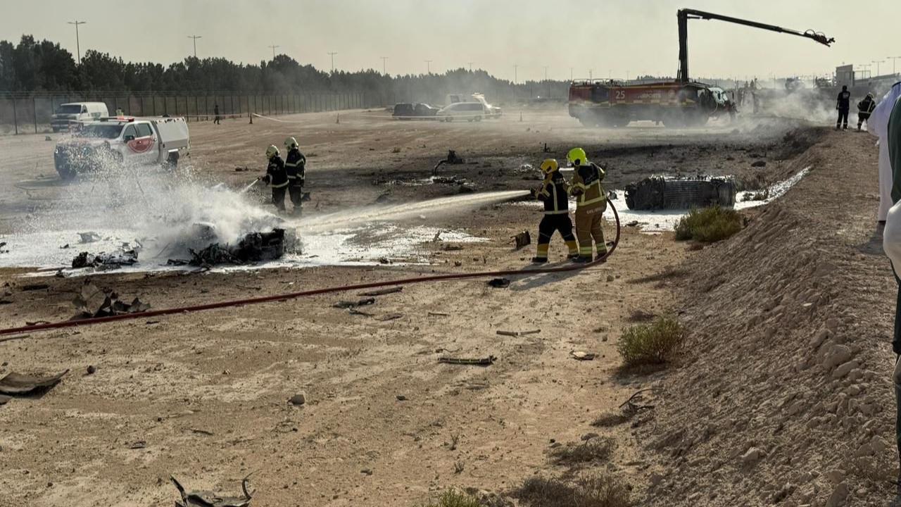 As smoke billowed out of the crash site, the sight left the spectators shocked. Pics/PTI and X (@DXBMediaOffice)