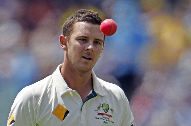 Aussie pacer Josh Hazzlewood gets ready to bowl with the pink ball during the first day-night cricket Test match at the Adelaide Oval on Friday. Pic/AFP