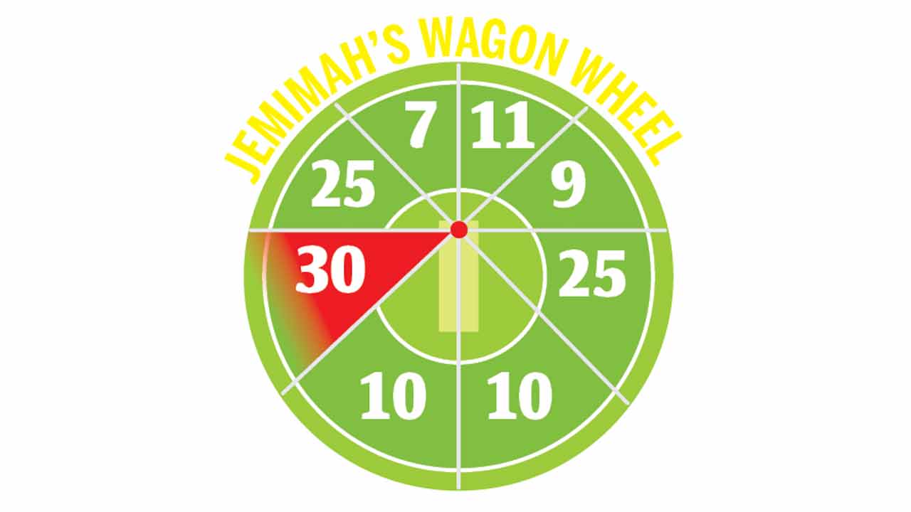 Jemimah scored 20 runs in the ‘V’ down the ground, perfectly split into 10 on each side. She didn’t shy away from getting creative either as she unleashed the reverse sweeps and scoops to score behind the wicket in the latter stages. India’s new No. 3 batter scored 18 runs in the ‘V’ behind the stumps. Her innings included plenty of running in the form of 57 singles and seven twos as well.