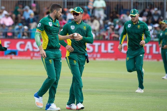 South African bowler Wayne Parnell (L) talks to skipper AB de Villiers during their One Day International (ODI) cricket match against Sri Lanka. Pic/PTI
