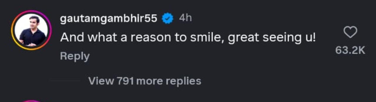 Responding to Dhoni's post, Gambhir commented saying, "And what a reason to smile, great seeing u!".