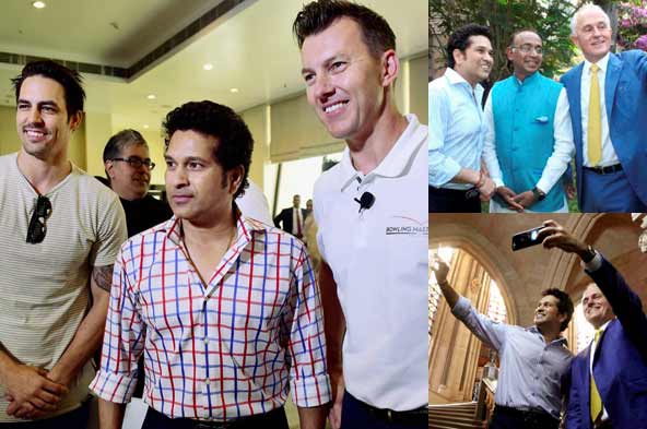 Australian Prime Minister Malcolm Turnbull shakes hands with former Indian cricketer Sachin Tendulkar in Mumbai on Wednesday. Pic/PTI