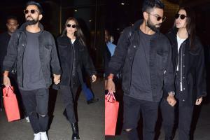 Virat Kohli was twinning with Anushka Sharma wearing a black t-shirt teamed with a black jacket and black jeans. He paired it with white shoes and black shades