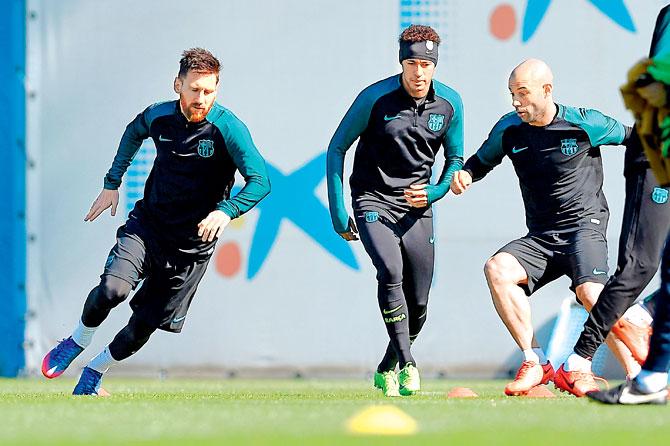 Barca's Lionel Messi (left), Neymar (centre) and Javier Mascherano during a training session in Barcelona yesterday. Pic/AFP
