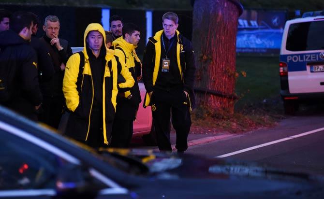 Police escort Dortmund's players after the team bus of Borussia Dortmund had some windows broken by an explosion some 10km away from the stadium prior to the UEFA Champions League 1st leg quarter-final football match BVB Borussia Dortmund v Monaco in Dortmund, western Germany. Photo/AFP