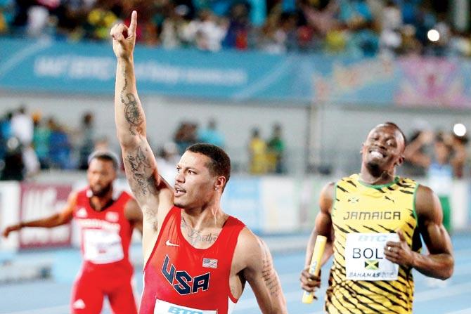 USA’s Ryan Bailey (in red) wins the 4x100m gold ahead of Jamaica’s Usain Bolt at the IAAF World Relays in the Bahamas yesterday. Pic/Getty Images