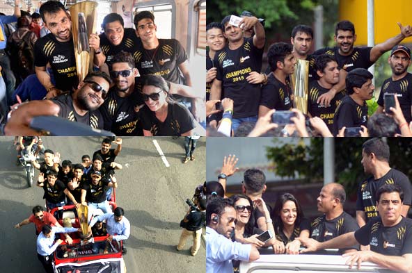 U Mumba kabaddi team members at Marine Drive during the their victory parade. (Pic/ Pradeep Dhivar)